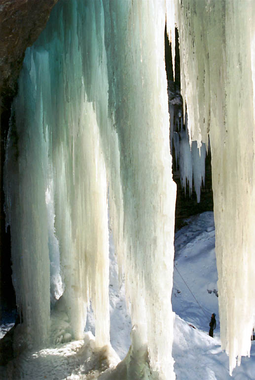 Huge sheets of ice at Tinker's Falls. I really like this picture because of the vibrant blue colors and the sense of scale that you get from seeing Steve belaying in the lower right corner.
