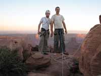 Around 3pm we gear up at the Castleton trailhead and start to hike. The temperature is around 98F every day we are in Moab, and it is still very hot. We hike quickly and reach the base of the climb at 4pm. At least now we are in the shade. We are climbing the North Chimney route (5.9-). I gear up and lead the first pitch, a long 5.8 with dual hand cracks. I'm feeling tired when I reach the belay, and we struggle to get the haul bag up the pitch, with Ryan climbing along next to the bag to free it when it jams in the rock. Ryan starts to lead the second pitch. Just as he reaches the crux of the entire climb -- and unprotected offwidth -- I start to feel faint. I give Ryan enough slack to get some good gear, and I tie off the belay. Yeah, I'm about the worst climbing partner on the planet. I never lose consciousness, but I do lose my vision for a bit. Ryan builds an anchor and hangs out while we discuss the situation. Two days of strenuous activity in dessert heat has messed up my body chemistry. I've been drinking plenty of water, but haven't eaten enough. I rummage through the haul bag and start eating. After 45 minutes I'm feeling well enough to continue belaying. Ryan finishes the pitch and brings up the haul bag with me following along to free it as it gets stuck. I'm still not nearly 100%, so Ryan leads the third pitch and brings up the bag. He saves the last 20' of easy climbing for me so I can lead one more pitch on the climb. Just as the sun sets, we arrive at the top of Castleton.