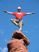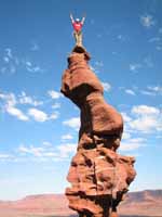 6/22 It is a great night and we sleep out under the stars at the Fisher Towers campground. We wake at 5am to climb Ancient Art before the sun makes things unbearably hot. We climb the whole tower free. When I had done this climb in October 2003 with Lauren, I aided the first bolt ladder. This time I led that section free. In theory this makes the climb 5.11, but Ryan and I feel it is a fair bit easier. I let Ryan have all the other pitches since I had led them all before. We pose for plenty of pictures on the summit corkscrew and still are down by 10am. We see no other climbers today. This pattern will continue throughout Utah and Nevada. We won't see another climber until we reach Yosemite. I guess climbing in the desert in late June isn't a popular activity.