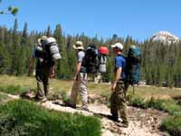 7/15 We take a well earned opportunity to sleep late and enjoy a leisurely morning. Then pack our gear for the easy hike out. Many thanks to Jason and Morri who carry more than their share of the gear so as to spare my ankle. Chris and Aaron had arrived while we were climbing Conness and have a site for us to share with them at Tuolumne Meadows.