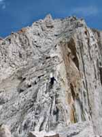It is a fantastic, moderate alpine climb. It can be climbed without any sustained sections of 5th class by starting about 50' left of the standard start. This is what the three soloists who passed us were doing (including the one who almost toppled off the knife edge ridge when he lost his balance). There is not a single bolt in the entire climb, but a light rack is sufficient if you are comfortable running it out on terrain up to 5.6.