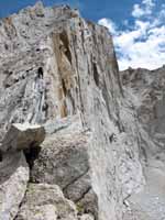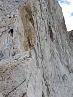 7/14 Awake at 5:30am to climb. We are a little slow getting started because we don't feel rushed. By 6:30am we are hiking. At 8:30am, and definitely feeling the affects of altitude, we reach the base of the West Ridge of Mt. Conness (5.6). We solo up 4th class terrain for about 50', then decide to rope up, which is a real hassle with no good ledge. Just rope up at the base. I lead P1 for a full 200'. I'm a bit too far left and end up making some awkward 5.7ish moves to get back on route. Morri leads P2 which goes about 150' to a nice belay. I lead P3 until I run out of rope at 200' which gets us just to the 4th class section. Morri leads P4 which we all simulclimb. He goes for at least 300' before building a belay. Morri keeps his position at the head and leads an even longer simul pitch for 400' or 500'. These two simul pitches traverse the knife edge ridge which runs right along the top of the 1000'+ dead vertical, southeast face. The exposure is amazing! I take the lead for P6, which we had intended to simul, but there are some clearly 5th class moves and we had agreed to belay anything above 4th class. So I climb a full 200' and belay up Jason and Morri. Then Morri leads another long simul pitch with more fantastic exposure as we step around the false summit to the final summit ridge. I take P8 which quickly becomes 3rd class as we simul the final 400' to the summit at 12,590' elevation.