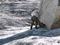 7/16 We start the day with Chris assuring us of the integrity of his climbing gear. Then the five of us head to Medlicott Dome. Jason and I climb Excellent Smithers (5.10a). The first pitch is 5.7 trad and goes easily, though the crack in the back of the left facing corner has far too many mandatory right foot jams. I claim that I deserve one ibuprofen for each jam. Jason comes up and I dump all the trad gear on his harness so I can lead P2 which is a 5.10a sport climb. This is a fantastic face climb and is tons of fun. I'm very happy to get the onsight... my first 5.10 onsight lead in Yosemite. Jason does a great job of following the pitch cleanly with a camelback and all of the gear on his harness. I start up P3, this time with trad gear. I lead up the first four bolts cleanly, though I nearly come off after throwing to a jug that turns out to be rounded and polished. Where the bolts end, the climb follows a left facing corner. There are supposed to be two pitons in this corner, but I don't see them. I assume I can get aliens in the pin scars, but there doesn't appear to be any other gear here. The climbing is supposed to be just as hard and sustained as the previous pitch and a half. I'm exhausted and not looking forward to taking a long fall, so I leave a biner and lower back to Jason. We bail off the climb. I'm kinda pissed to leave the biner -- a 9 year old, $5 omega locking D -- because I had a brand new quicklink which I just bootied at The Bihedrals in Boulder Canyon, but had left it (and a dozen other bail biners) on the ground so I wouldn't be tempted to bail. Oh well.