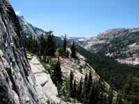 7/17 5am start for all of us. We hike two hours to the base of Cathedral Peak. We climb the classic Southeast Buttress (5.6) which is wide enough that multiple parties can climb simultaneously without interference. Jason, Chris and I start near the middle while Morri and Aaron start near the left. In retrospect, my choice of lines really sucked. P1 is annoying, filled with choss and poor gear. At 200' I cobble together an anchor and bring up Jason and Chris. P2 gets us on to the more commonly climbed line. P3 is awesome. P4 is an awkward chimney which is still plenty fun. Midway through the pitch, I have to take off my helmet and clip it to my harness so that my head can fit through the chimney. P5 has lots of fun moves -- including a 5.6 finger crack through a bulge -- and by stretching it for a full 200' I am able to reach the summit. We hang out on top taking pictures while waiting for Morri and Aaron. Then the five of us head down and back to camp.