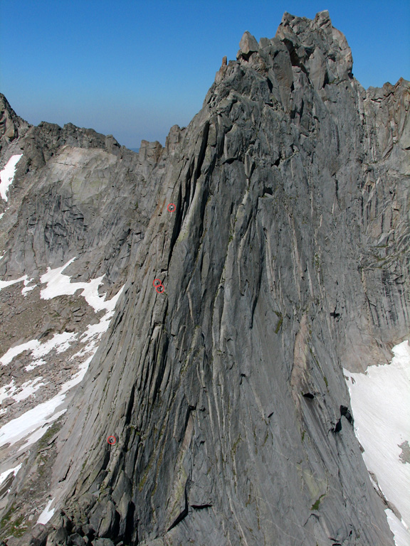 out of sight. This picture was taken at 10:20am -- when we climbed this route a few days later we were on the ridge by 7:30am. We were the first party on the route