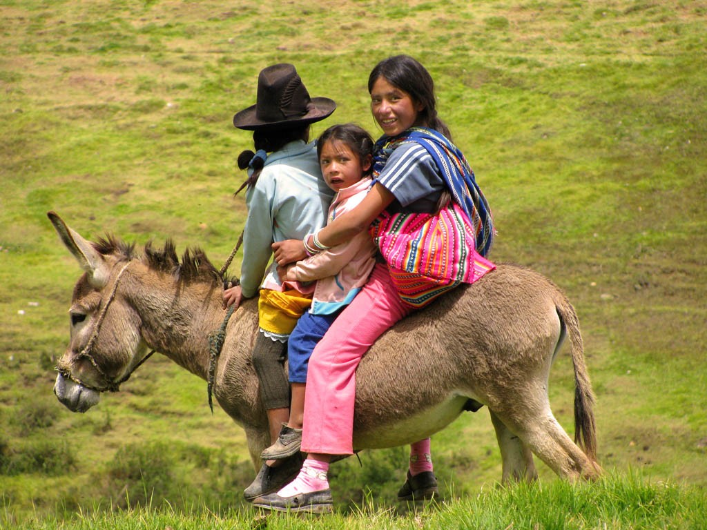 Three Quechua girls on a donkey.