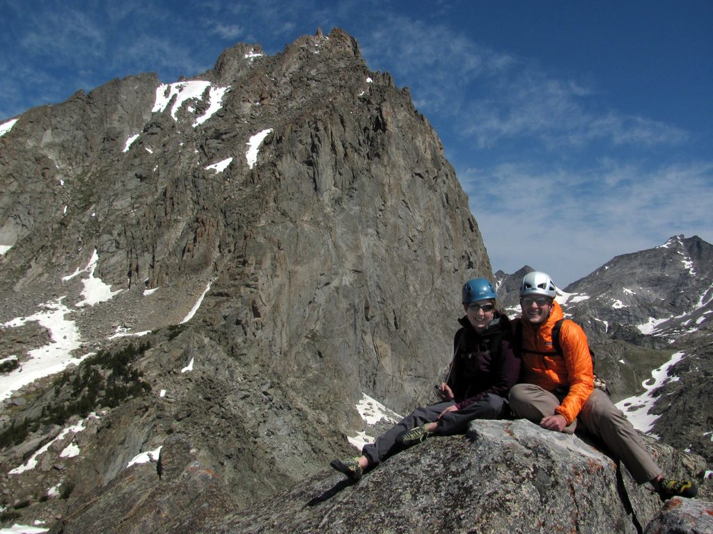 Beth and Mike on the summit of Sundance Pinnacle. Warbonnet towering in the background.