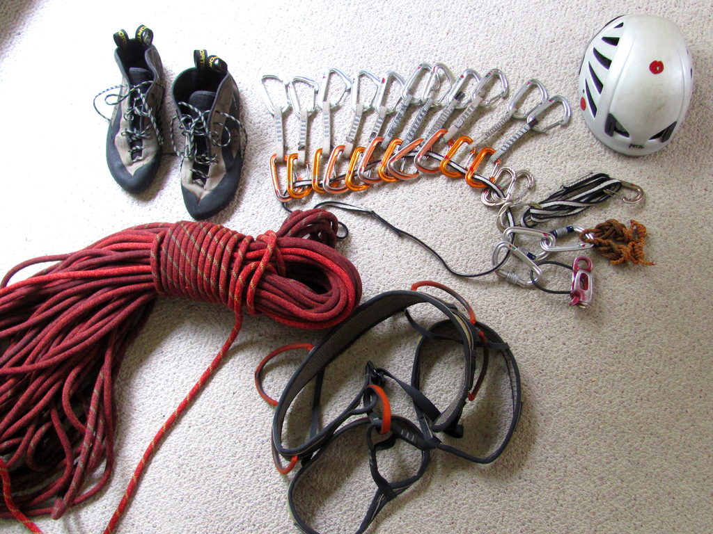 All my climbing gear for the trip. Including the most minimal rack ever: two pounds, five ounces.