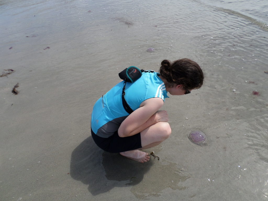 Then we stood around for about fifteen minutes with our toes in the water, vigilant for the jellyfish that were EVERYWHERE. We really wanted to swim, and weighed the idea that it would be worth it even if we got stung, and decided it wasn't worth it, but couldn't quite leave. Then we saw a toddler in a pink bikini barrel down the beach holding a jellyfish and screaming "Look Daddy, I got one!" We were both checking ourselves from shouting for her to drop it. But then her father followed her into the water, scooped up a jellyfish, and tossed it at her. We asked him if they stung, and he said no, and dropped one into our hands. Then we swam! It turns out that brushing up against floating gelatinous blobs every few seconds is a totally painless but very odd feeling.